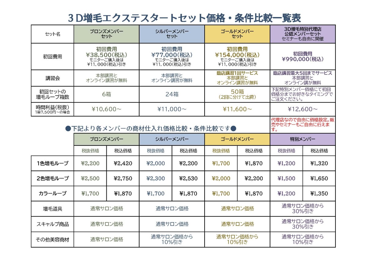 ・スタートセット(27,500円〜154,000円)増毛ループ、増毛用具、販促ツールなどが含まれます。臨店講習費が含まれている場合もあります。